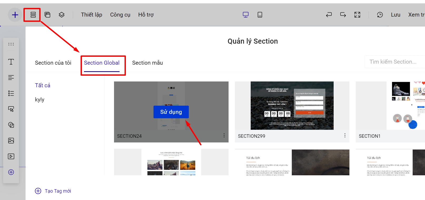 Trang landing page nào bạn muốn sử dụng Section Global, bạn vào danh sách Section Global, bấm sử dụng Section Global bạn muốn.