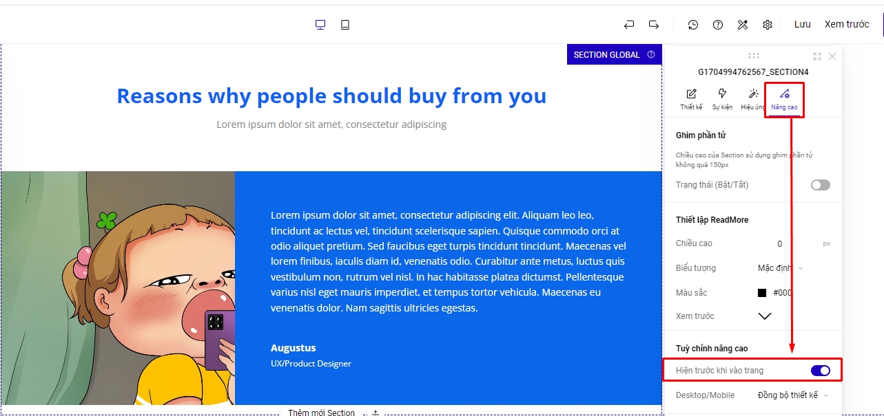 Truy cập mục cài dặt của section global -> Nâng cao -> Tùy chỉnh nâng cao, bật nút Hiển thị khi vào trang