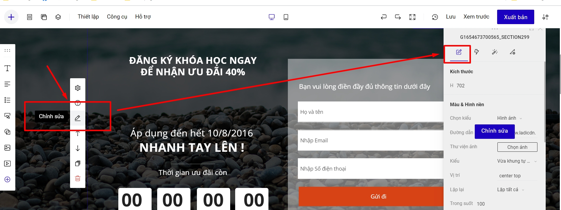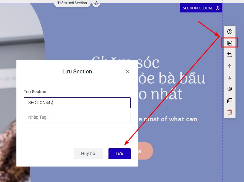 Sau khi chỉnh sửa nội dung theo mong muốn của bạn, bạn cần bấm vào nút LƯU trên Section,để có thể lưu lại nội dung vừa thao tác và cập nhật nội dung cho toàn bộ các trang landing page đang sử dụng section Global đó.