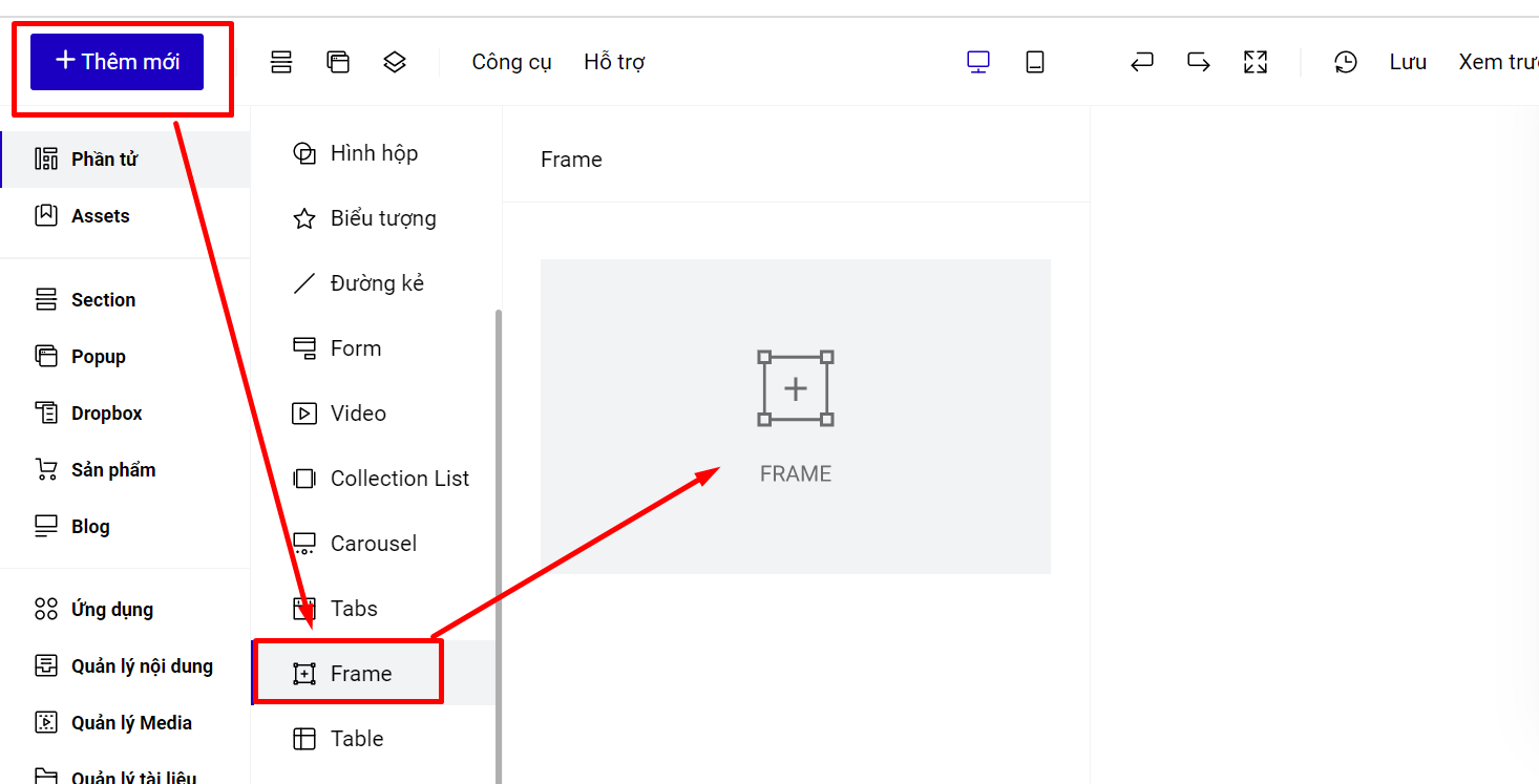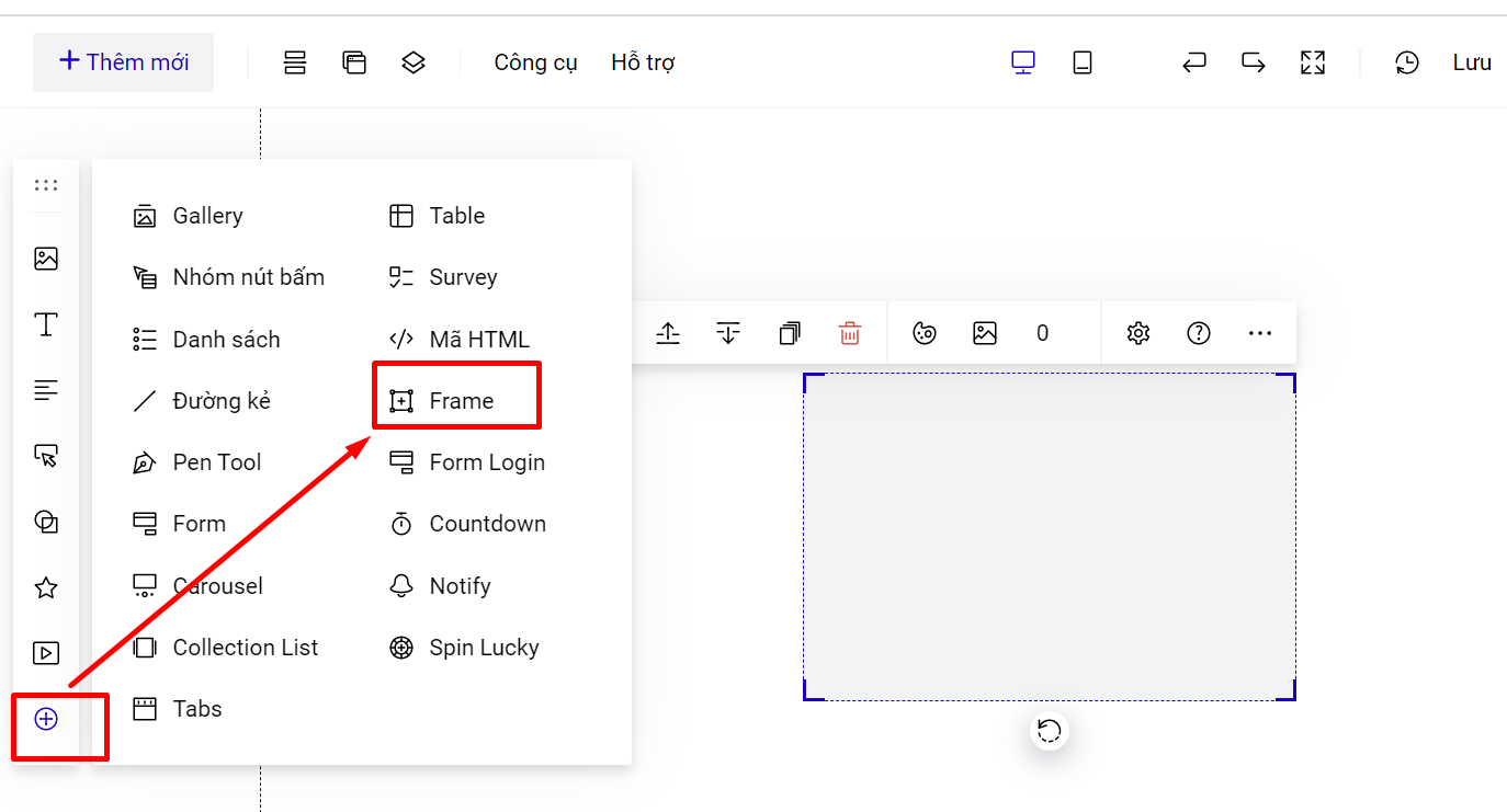 Hoặc vào phần Thêm mới--> Phần tử--> Frame.
