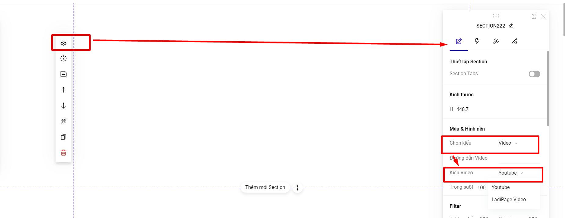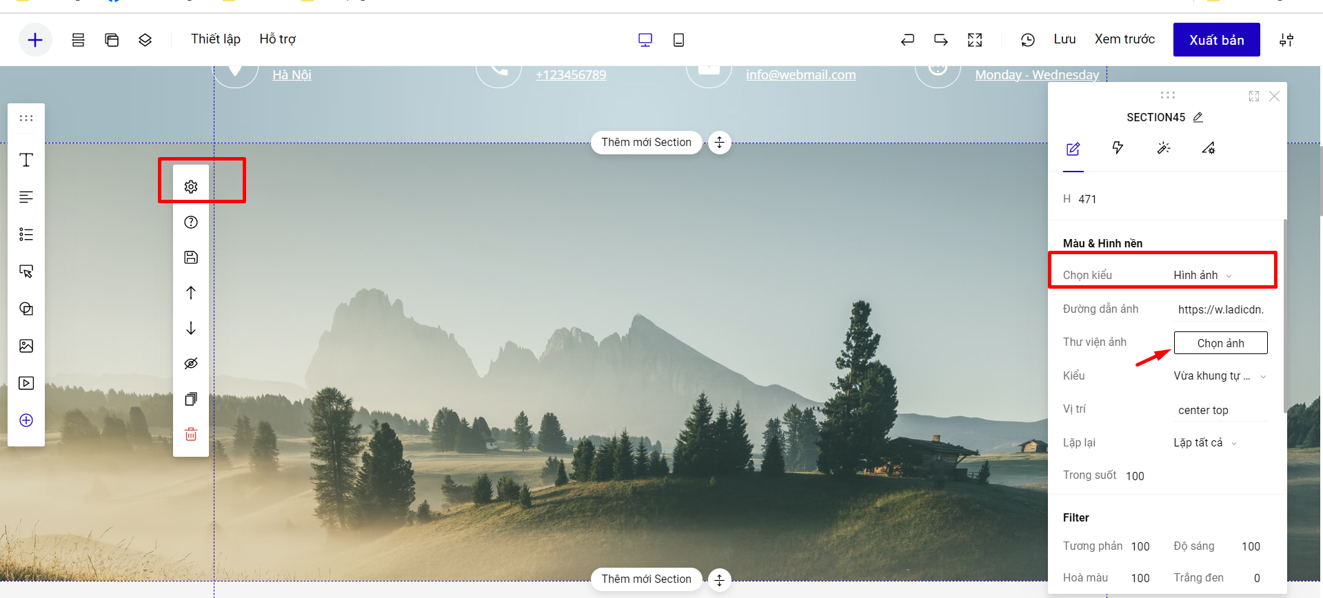 Phần nền của một section có thể thể hiện dưới 3 dạng: Hình ảnh, Màu sắc hoặc Video.