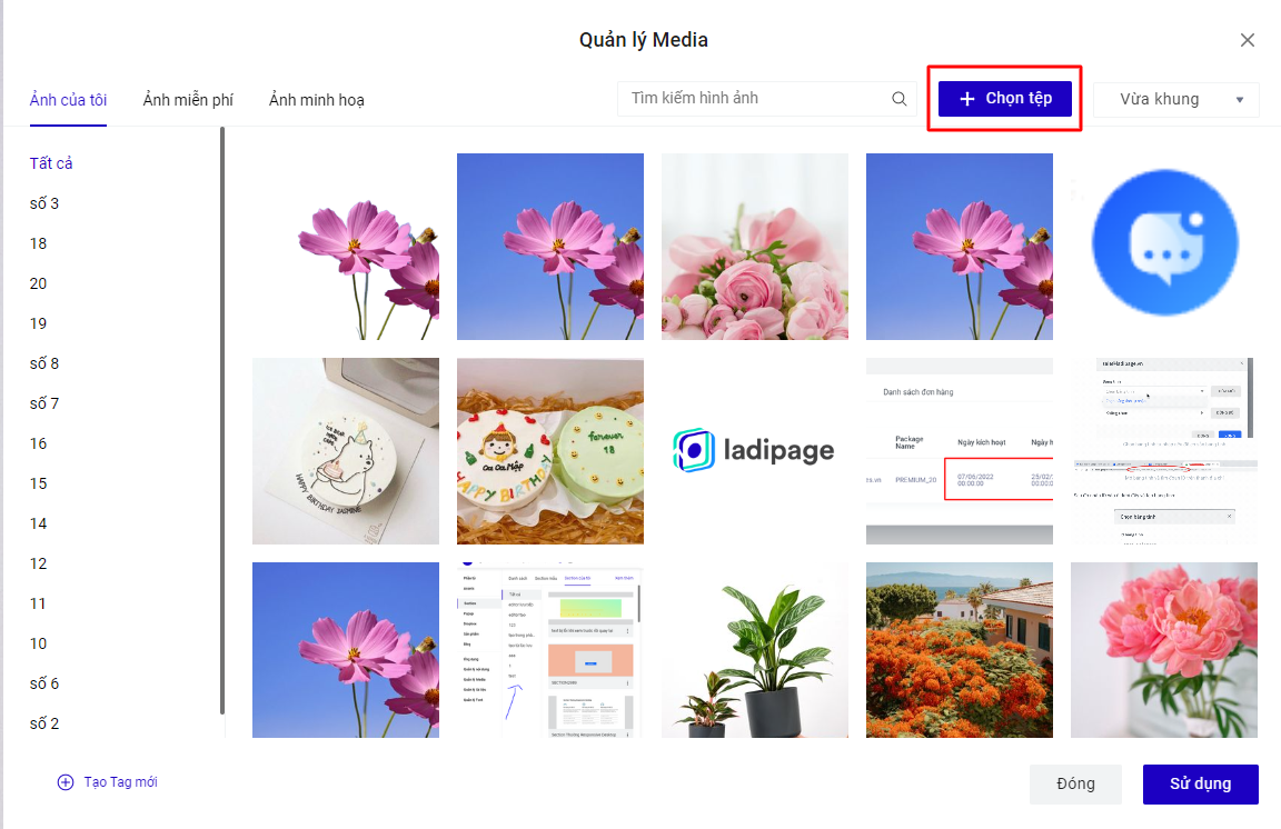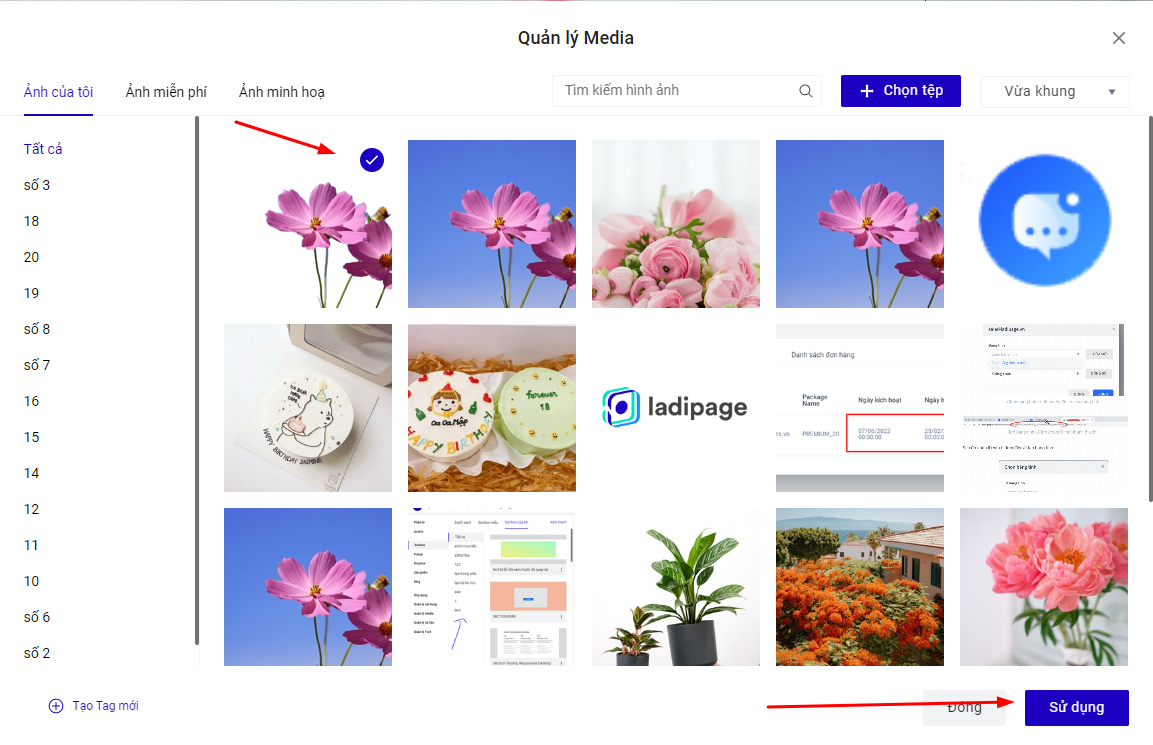 Chọn ảnh bạn vừa tải lên từ danh sách ảnh trong thư viện sau đó bấm nút Sử dụng để chèn ảnh vào Landing Page hoặc bạn có thể click đúp vào ảnh muốn chèn.