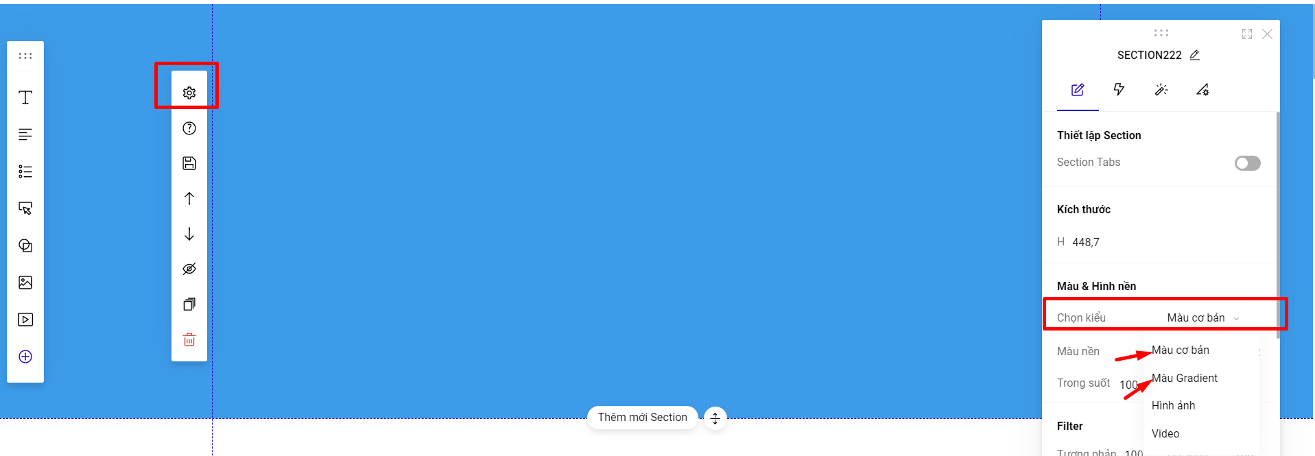 3. Nền section chọn kiểu Màu cơ bản hoặc Màu gradient.