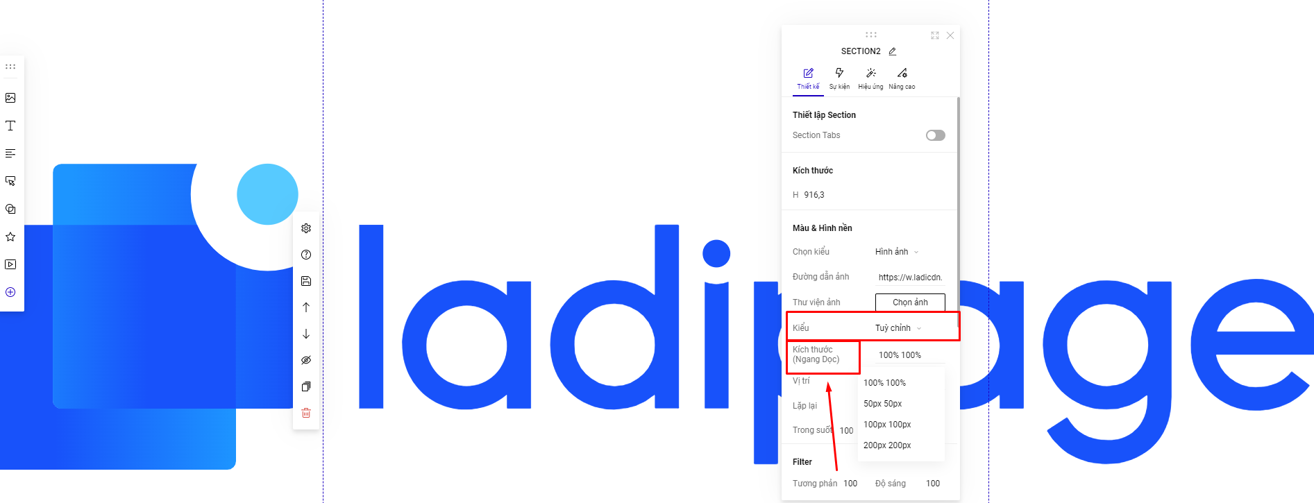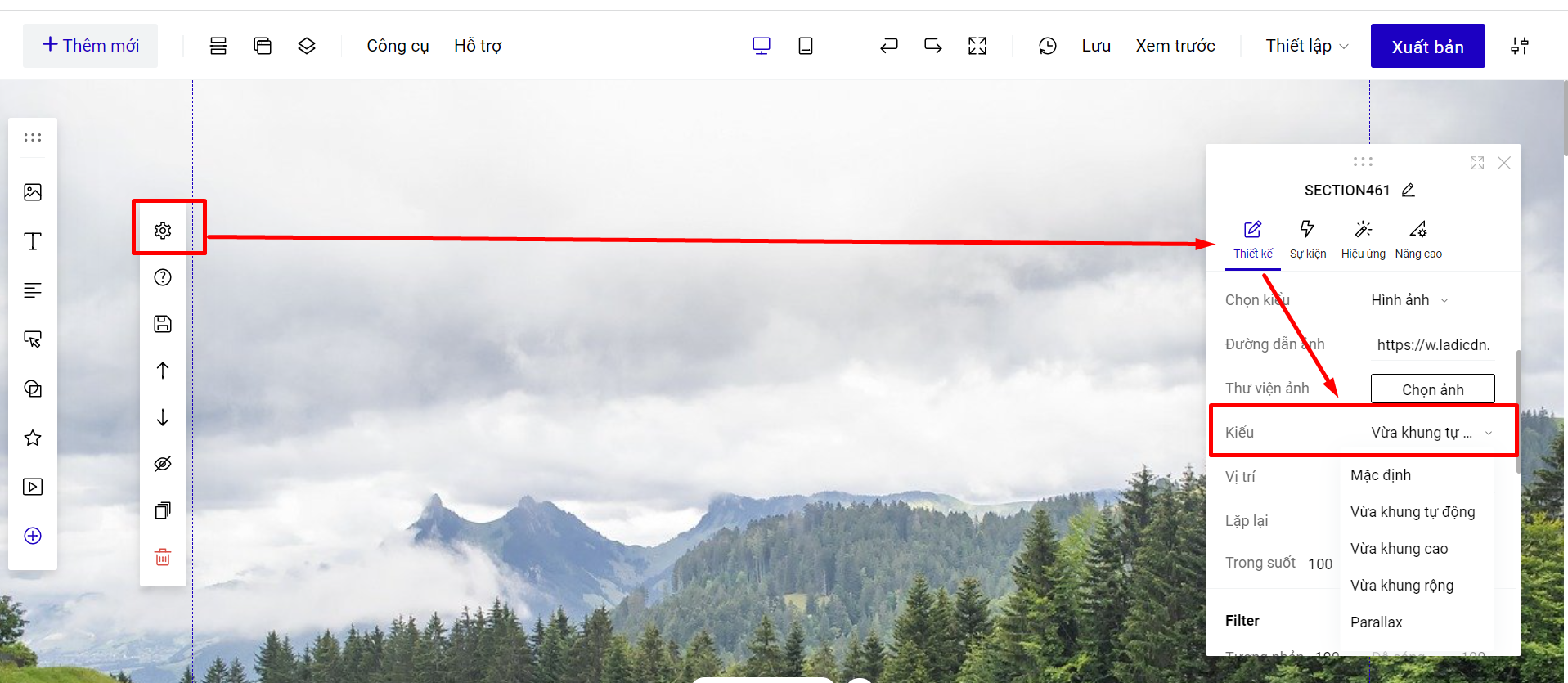 Bạn có thể chọn các kiểu cho ảnh nền section: Vừa khung tự động, Mặc định, Vừa khung cao, Vừa khung rộng và Parallax hoặc Tùy Chỉnh lại kiểu hiển thị của ảnh