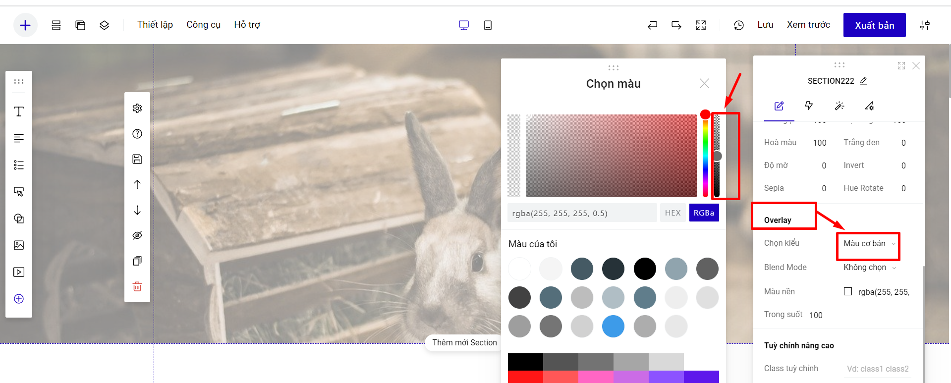 Bạn có thể đồ màu nền cho section bằng cách sử dụng Màu cơ bản hoặc Màu Gradient: