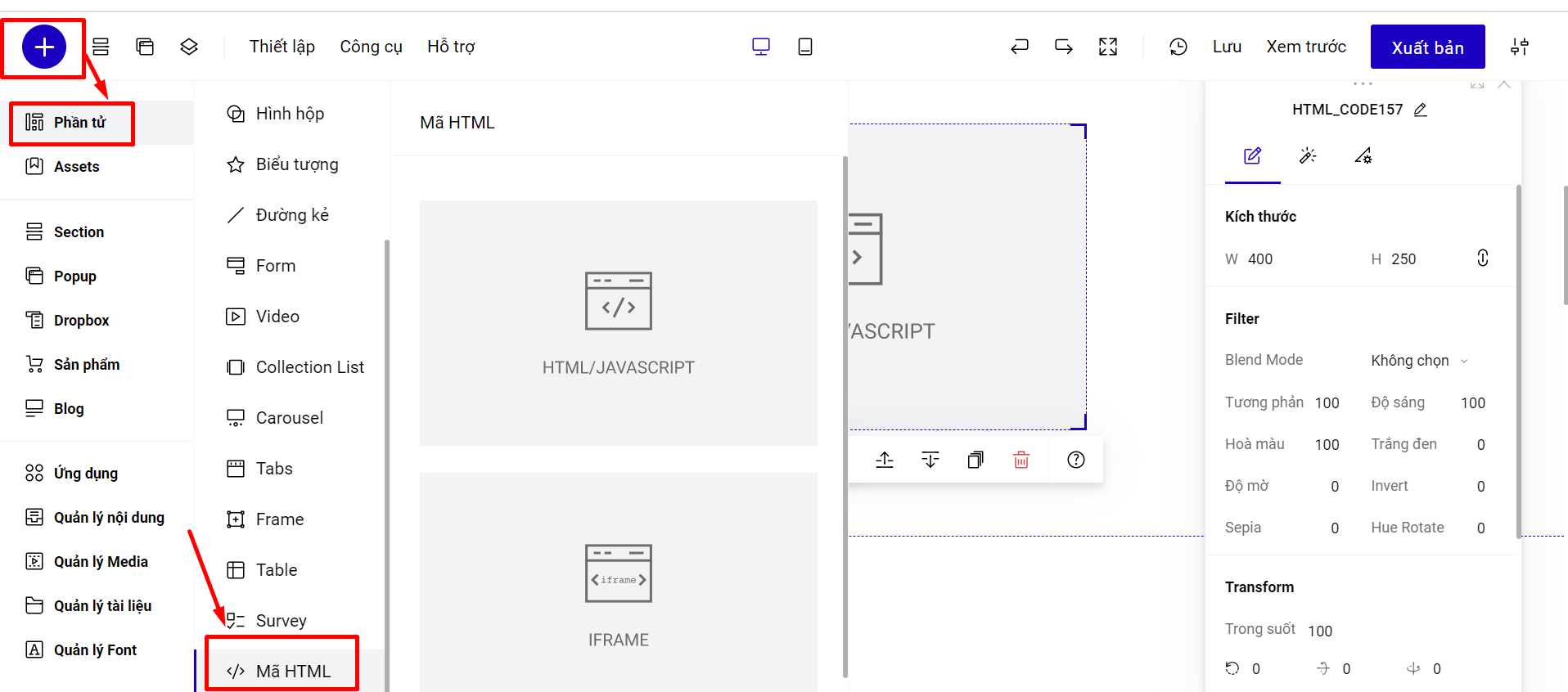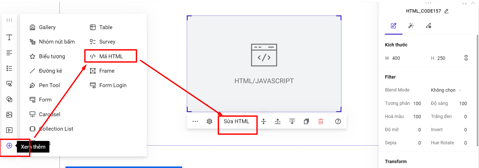 Để chèn phần tử HTML bạn có thể chọn Mã HTML tại thanh công cụ nhanh.