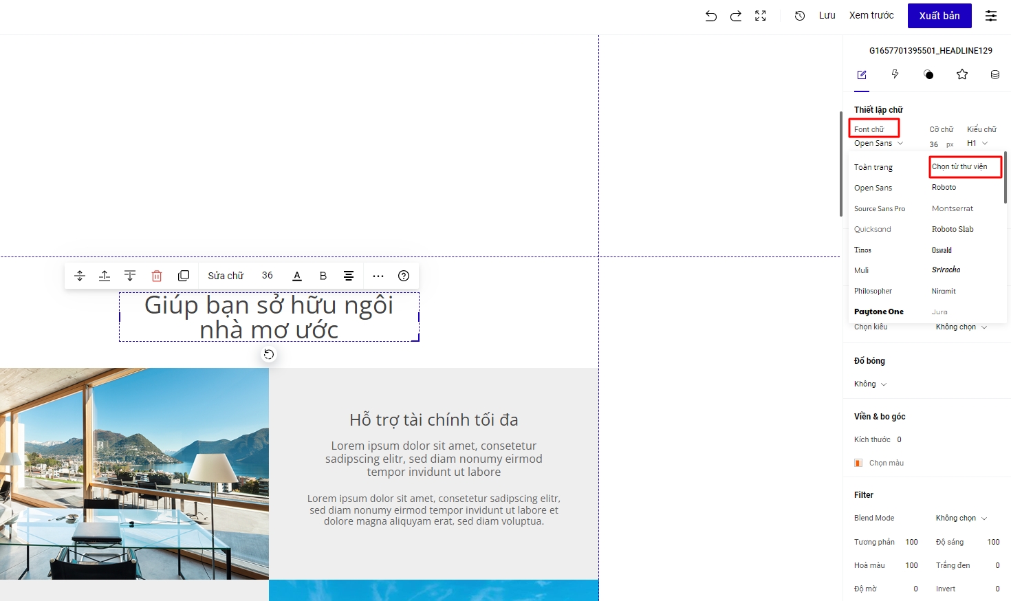 Các file font sau khi được tải lên và lưu trữ trong phần quản lý font thì sẽ tự động hiện ra trong danh sách chọn font ở các phần tử khi bấm vào mục Chọn từ thư viện.