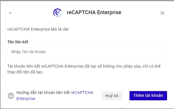Tài khoản liên kết Google Recaptcha Enterprise đã tạo sẽ KHÔNG cho phép xóa, chỉ có thể thay đổi Tên đã tạo