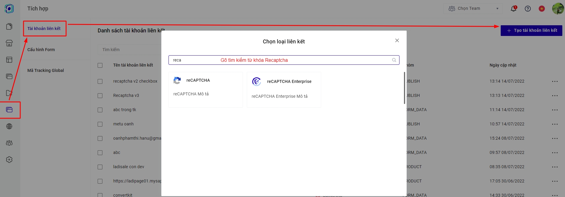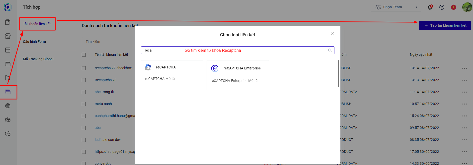Cách 1 : Truy cập trang builder.ladipage.com, chọn menu Tích hợp -> Tài khoản liên kết -> Tạo tài khoản liên kết. Sau đó lựa chọn Loại tài khoản là Google reCaptcha Enterprise