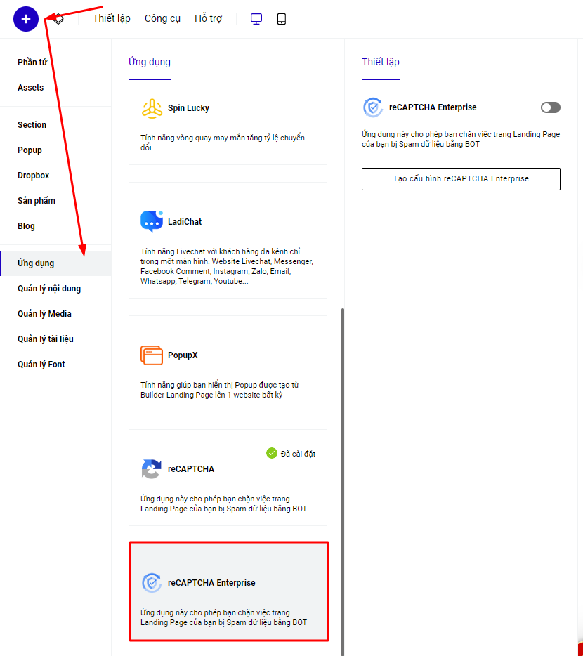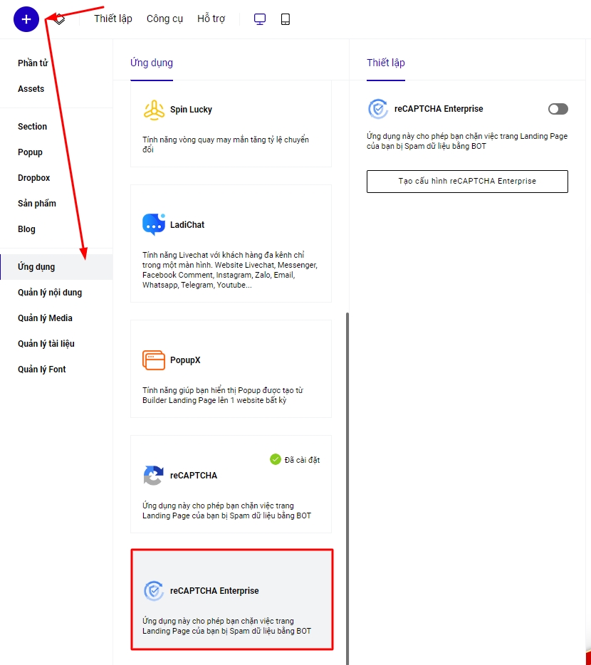 Truy cập vào builder của trang landingpage mà bạn muốn bật tính năng Google recaptcha Enterprise, thanh công cụ trên cùng, Thêm mới-Ứng dụng -> Google Recaptcha Enterprise. Bạn bật sử dụng ứng dụng và chọn cấu hình đã tạo trước đó