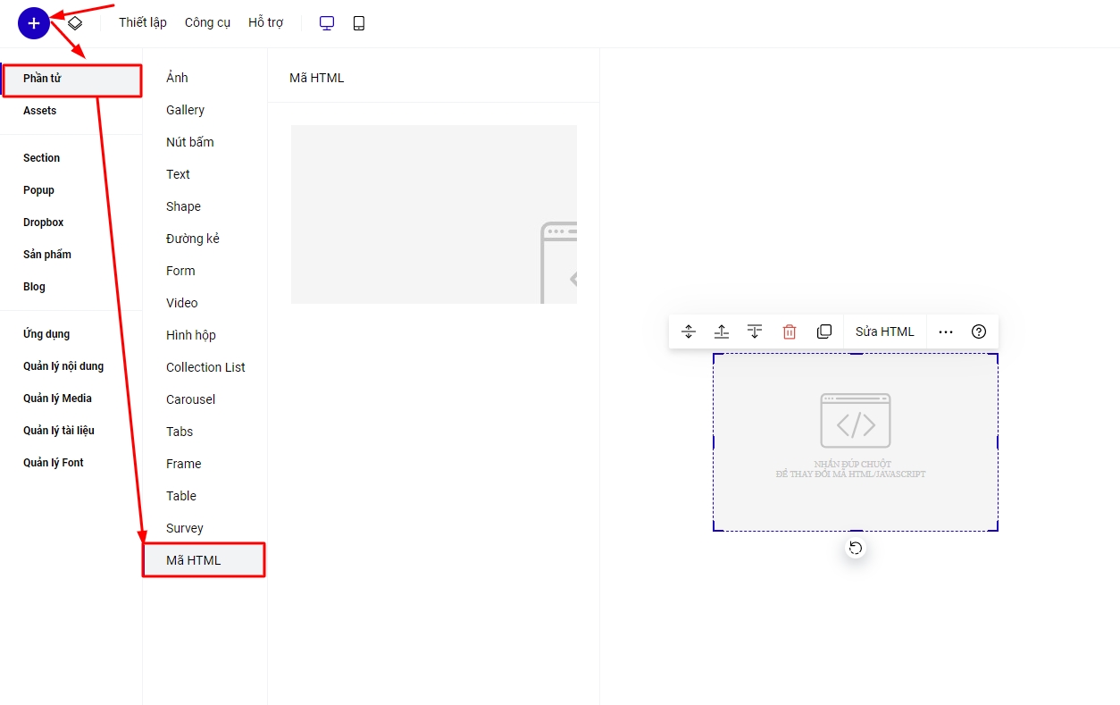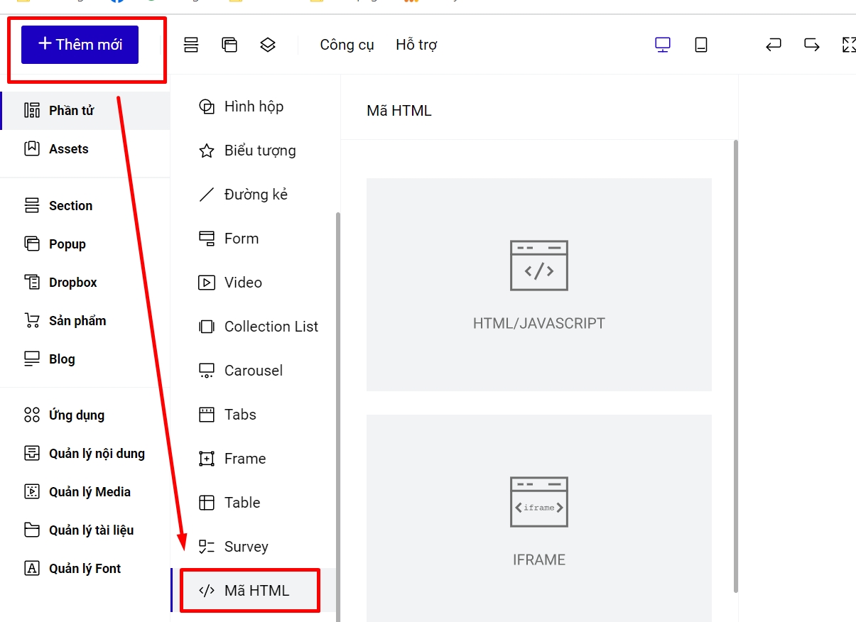 Hoặc bạn vào mục Thêm mới--> Phần tử--> Mã HTML.