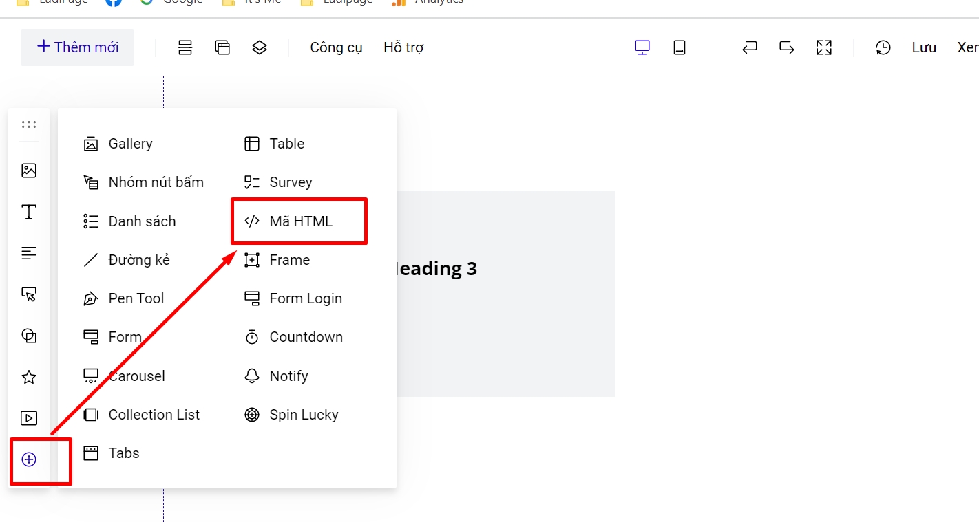 4. Tại trang giao diện chỉnh sửa Landing Page, tại thanh công cụ nhanh bên trái chọn Mã HTML.