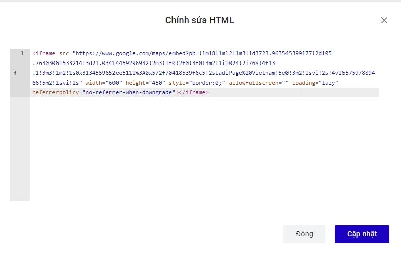 5. Bấm chọn Sửa HTML sau đó dán đoạn mã HTML vừa copy được từ Google Maps vào và bấm nút cập nhật. Sau đó di chuyển phần tử đến vị trí mong muốn hiển thị trên Landing Page.