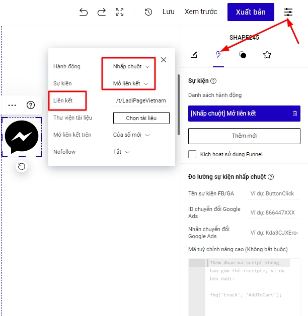 Bước 2: Liên kết biểu tượng vừa tạo với đường dẫn https://www.messenger.com/t/LadiPageVietnam (thay LadiPageVietnam bằng tên đường dẫn fanpage của bạn).