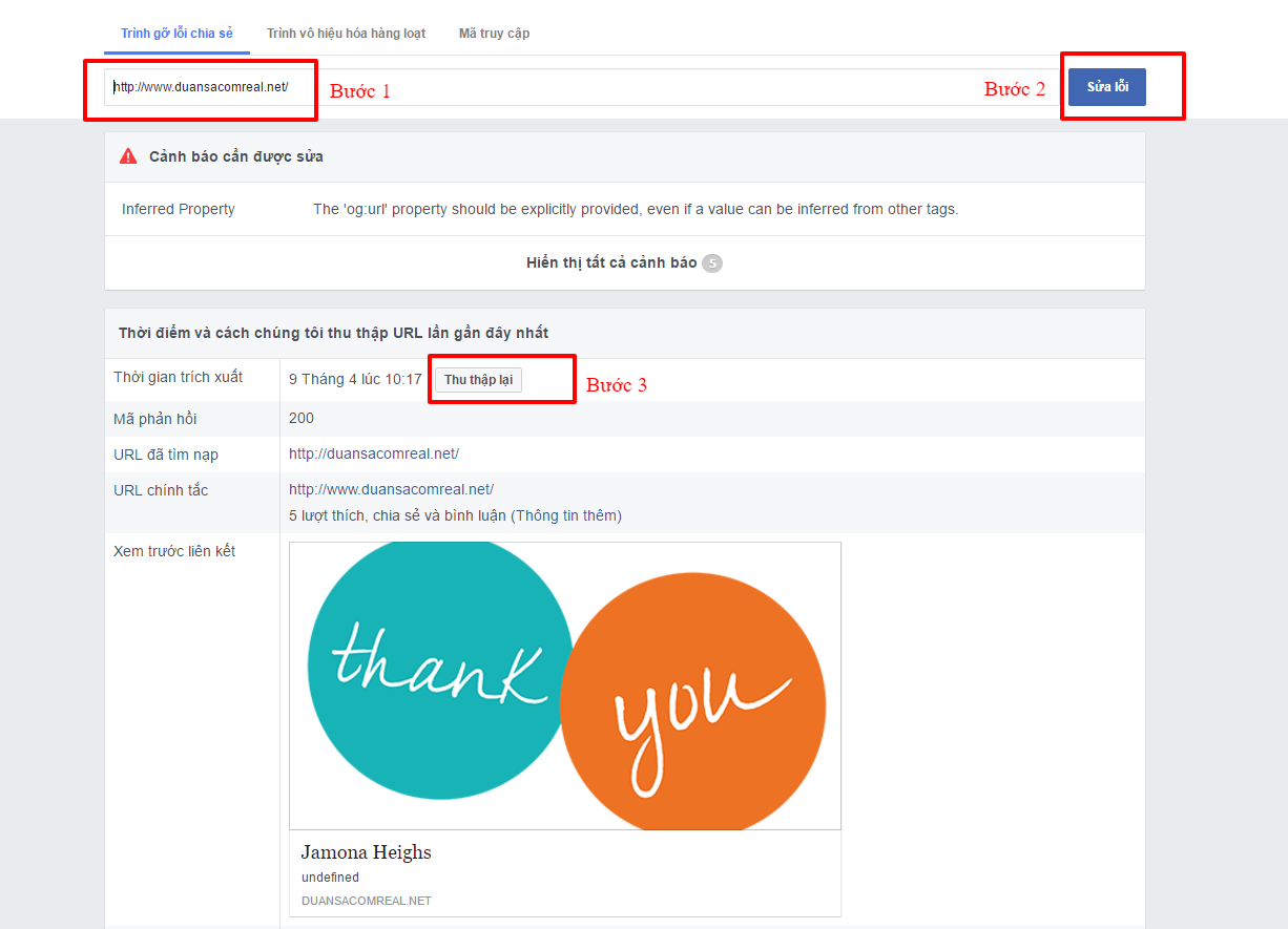Bước 3: Click vào “Thu thập lại” đến khi hiện thị nội dung/ hình ảnh chia sẻ đúng như ở bên dưới.