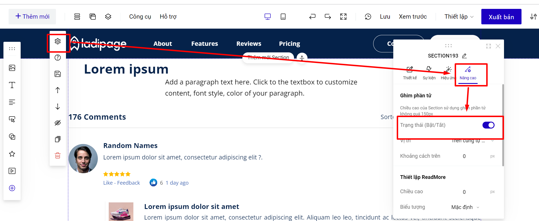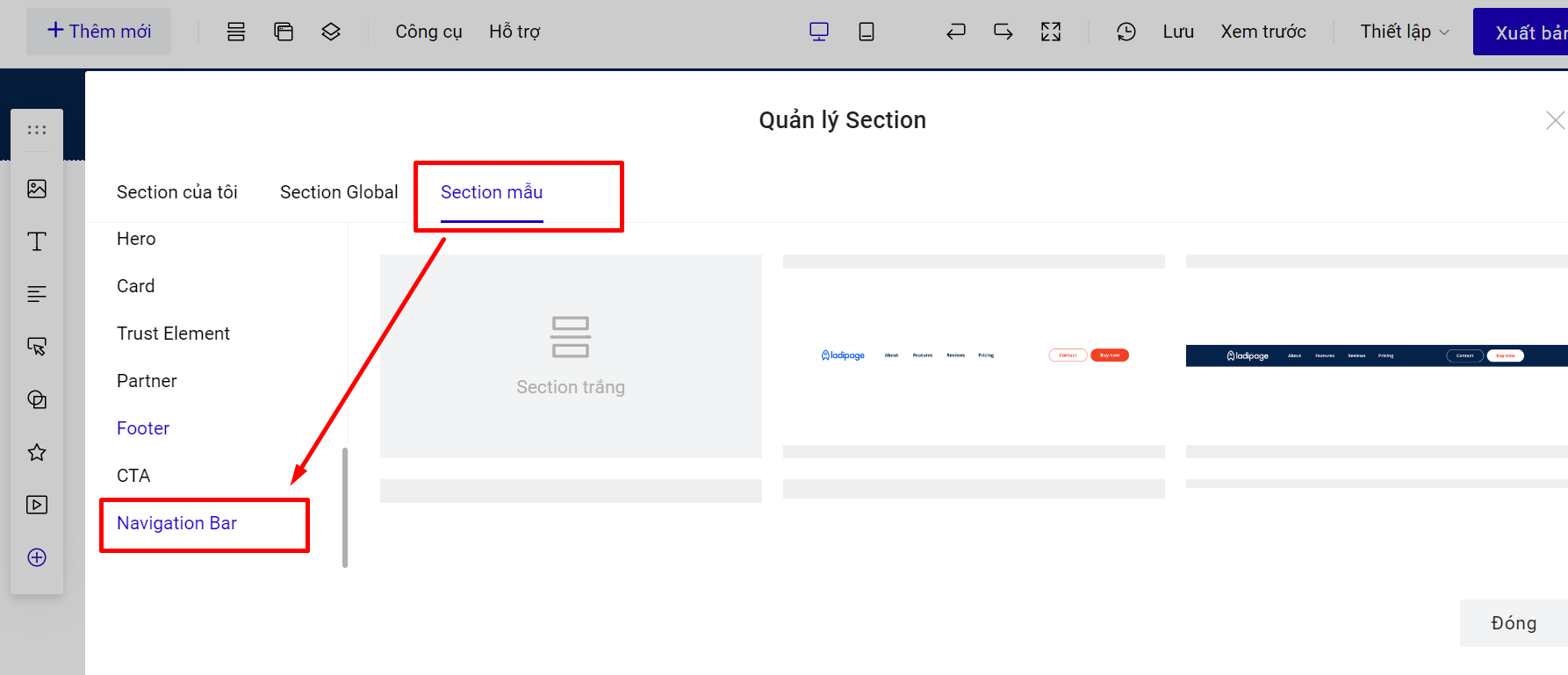 Bạn có thể sử dụng section menu mẫu tại LadiPage.