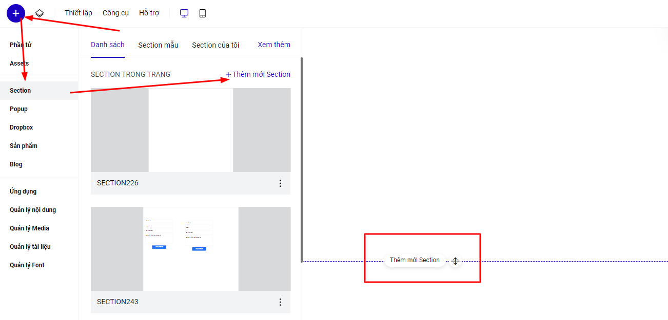 Bạn truy cập vào mục Thêm mới-->Thêm mới Section để tạo mới 1 section hoặc sử dụng nút thêm mới section trên builder thiết kế.