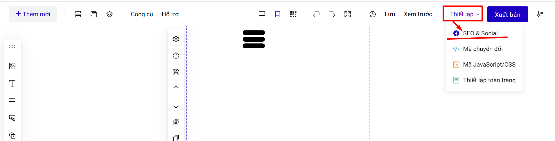 Các cài đặt từ khóa SEO về trang và gắn mã tracking nằm trong mục Thiết lập--> SEO & Social.