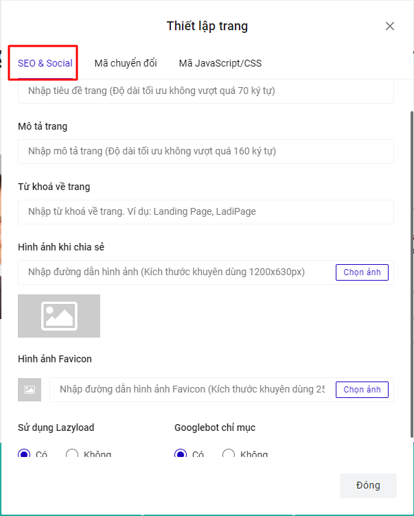 Phần cài đặt SEO & Social cho phép bạn tùy chỉnh các mục như Tiêu đề trang, Mô tả trang, Từ khóa về trang, Hình ảnh khi chia sẻ và Hình ảnh Favicon. Các nội dung này sẽ hiển thị khi bạn gửi đường dẫn hay đăng đường dẫn url trên faceb, zalo, các ứng dụng mạng xã hội ...