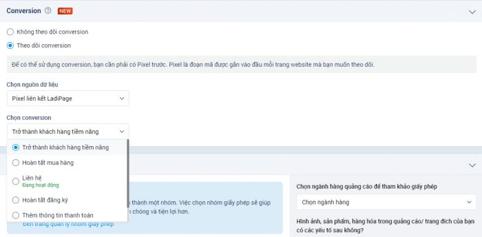 Bước 2: Tại phần thiết lập quảng cáo Zalo Ads, nhà quảng cáo chọn nguồn “Pixel liên kết LadiPage“, sau đó chọn conversion hoạt động và sau đó gửi duyệt quảng cáo.