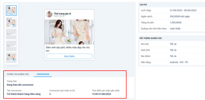 – Nhà quảng cáo có thể xem danh sách conversion được tạo ra, theo dõi tổng số conversion của website và tổng số conversion đến từ quảng cáo