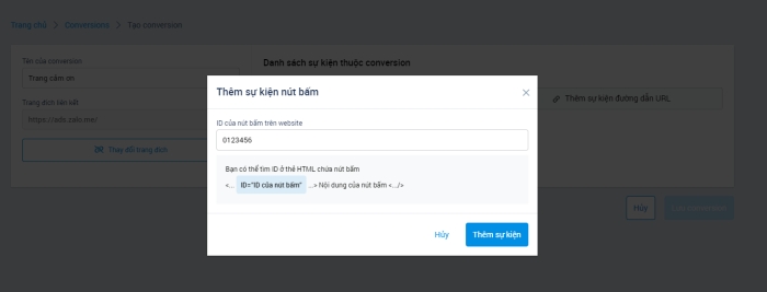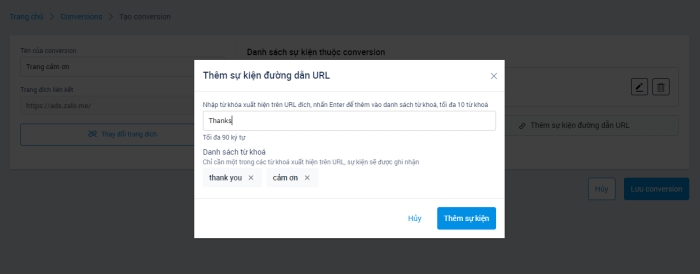 Bước 4: Nhà quảng cáo chọn Tạo conversion; tại trang tạo conversion nhà quảng cáo đặt tên conversion và nhập đường dẫn website. Sau đó nhà quảng cáo có thể chọn đo lường conversion này bằng 2 cách là Thêm sự kiện nút bấm hoặc nhập từ khóa để Thêm sự kiện đường dẫn URL. Cuối cùng nhà quảng cáo chọn Lưu conversion.