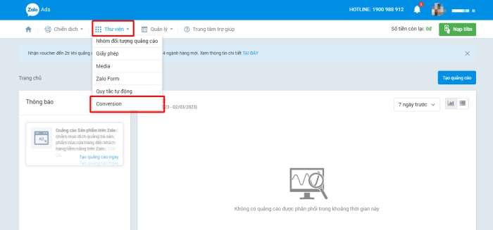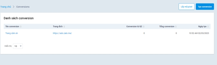 Để theo dõi báo cáo Zalo Ads pixel, nhà quảng cáo chọn Thư viện sau đó chọn Conversion. Nhà quảng cáo có thể xem được danh sách conversion của mình và các số liệu liên quan.