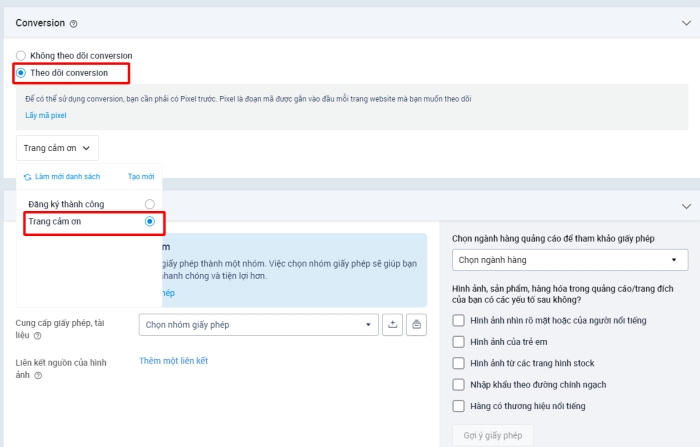 Bước 6: Tại phần thiết lập quảng cáo, nhà quảng cáo chọn Theo dõi conversion và chọn 1 trong các conversion trong danh sách đã lưu. Sau đó nhà quảng cáo gửi duyệt quảng cáo.