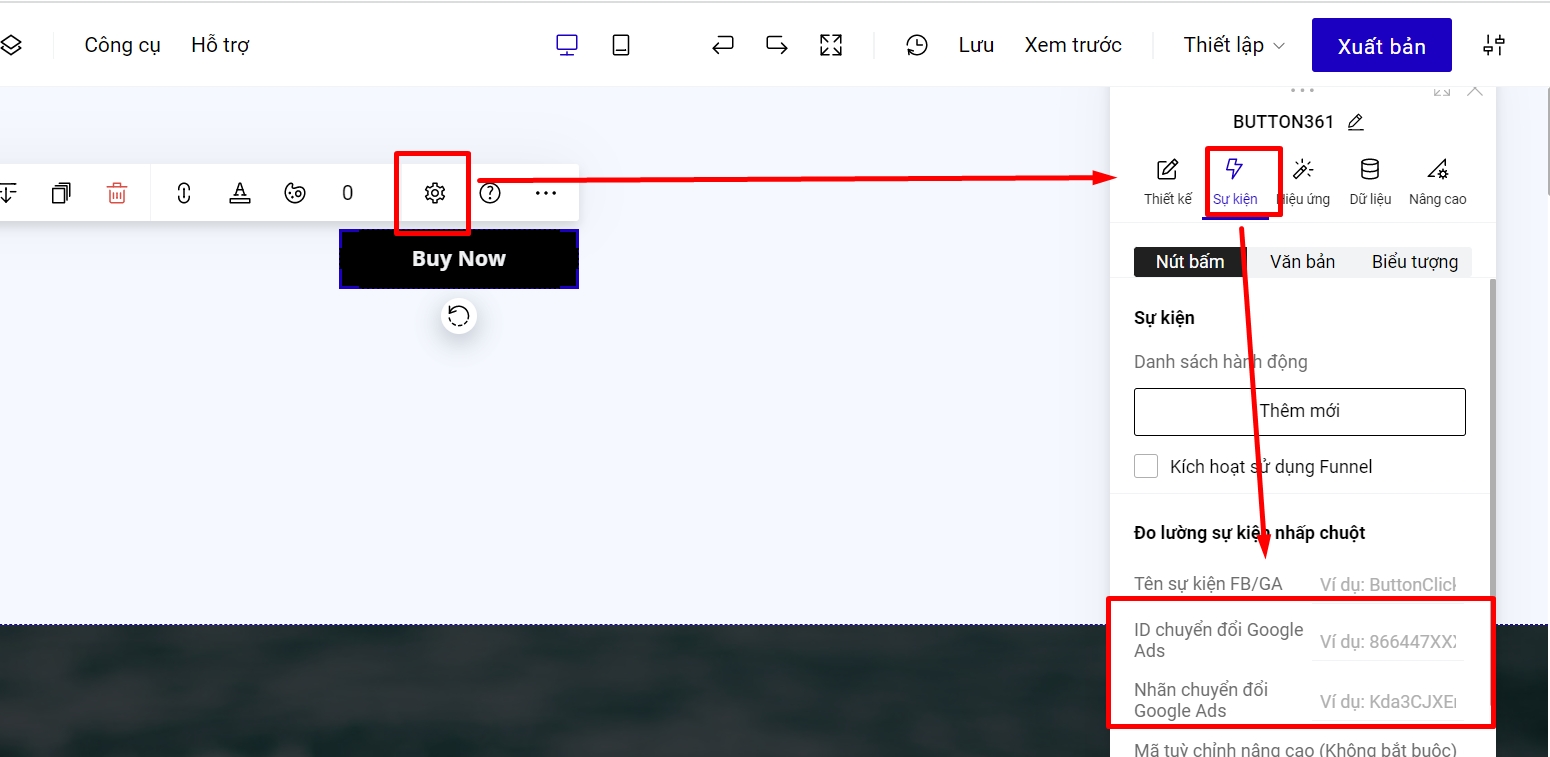Bạn vào phần thiết lập của nút bấm, nhập ID chuyển đổi và nhãn chuyển đổi vào phần đo lường sự kiện nhấp chuột: