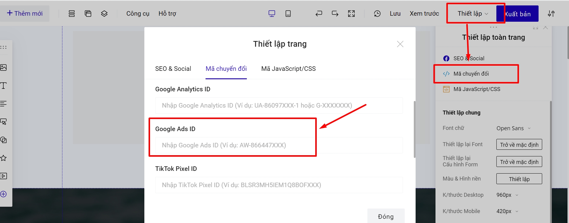 Bước 2 : Truy cập builder chỉnh sửa trang landingpage, mục Thiết lập -> Mã chuyển đổi -> Google Ads ID