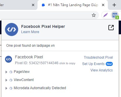 Truy cập trang và thực hiện các hành vi nhấp chuột cũng như điền form rồi theo dõi tích xanh trên add-on Pixel Helper: