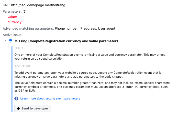 Khi gắn các mã Hoàn thành đăng ký (Complete Registration), hay là Mua hàng (Purchase), hay là Lead, bạn sẽ bắt gặp thông báo yêu cầu bổ sung giá trị tiền tệ của Facebook: