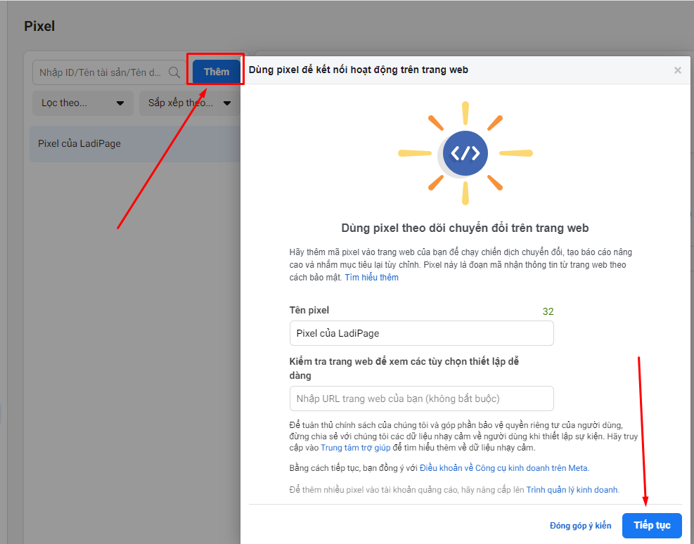 Bấm Thêm -> Tiếp tục để thêm mới ID facebook pixel