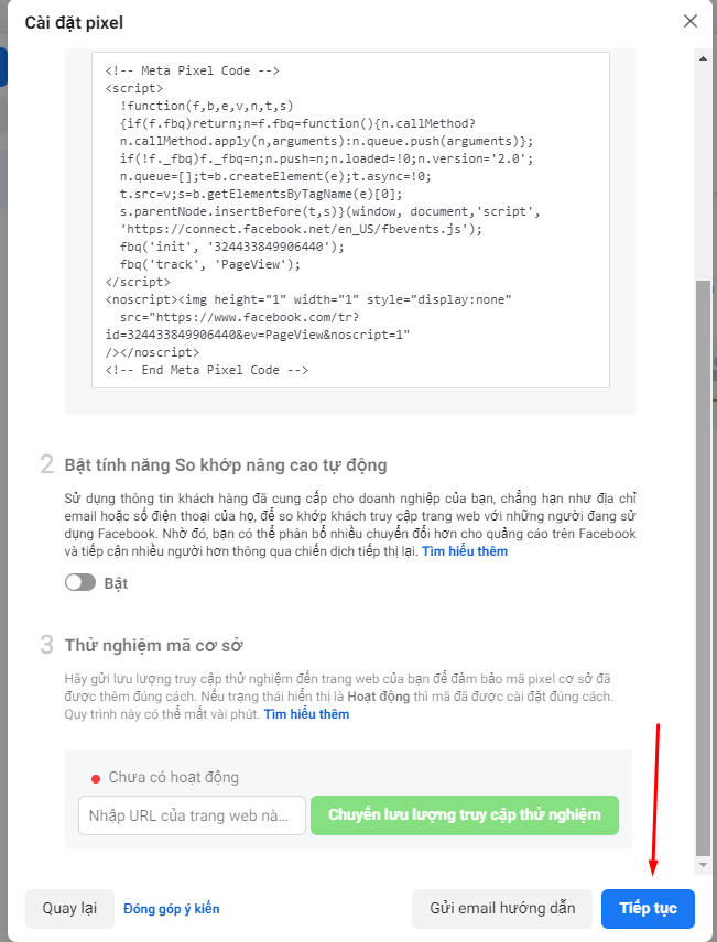 Bước 5: Hộp thoại Cài đặt mã pixel hiện lên, chọn Tiếp tục và không cần làm theo các bước mà facebook hướng dẫn trong hộp thoại.