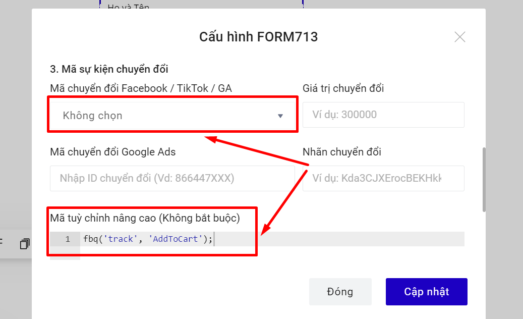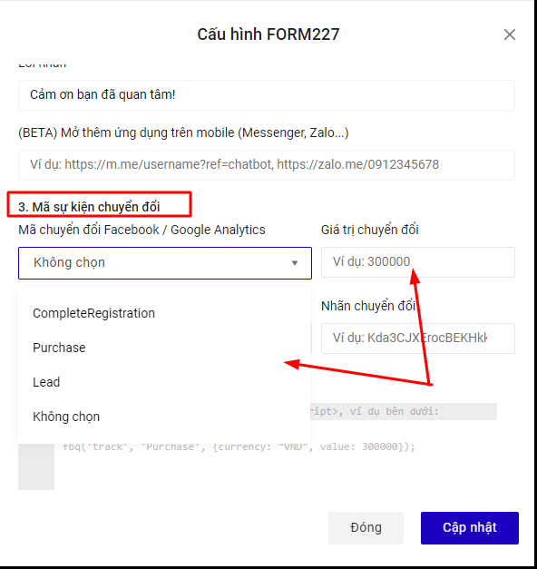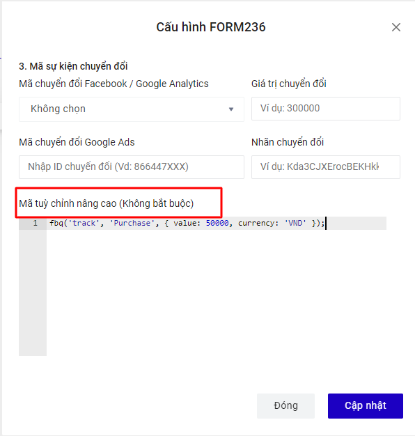 Lưu ý: Không chọn mã sự kiện chuyển đổi trong form nếu đã gắn mã code theo dõi trên trang cảm ơn.