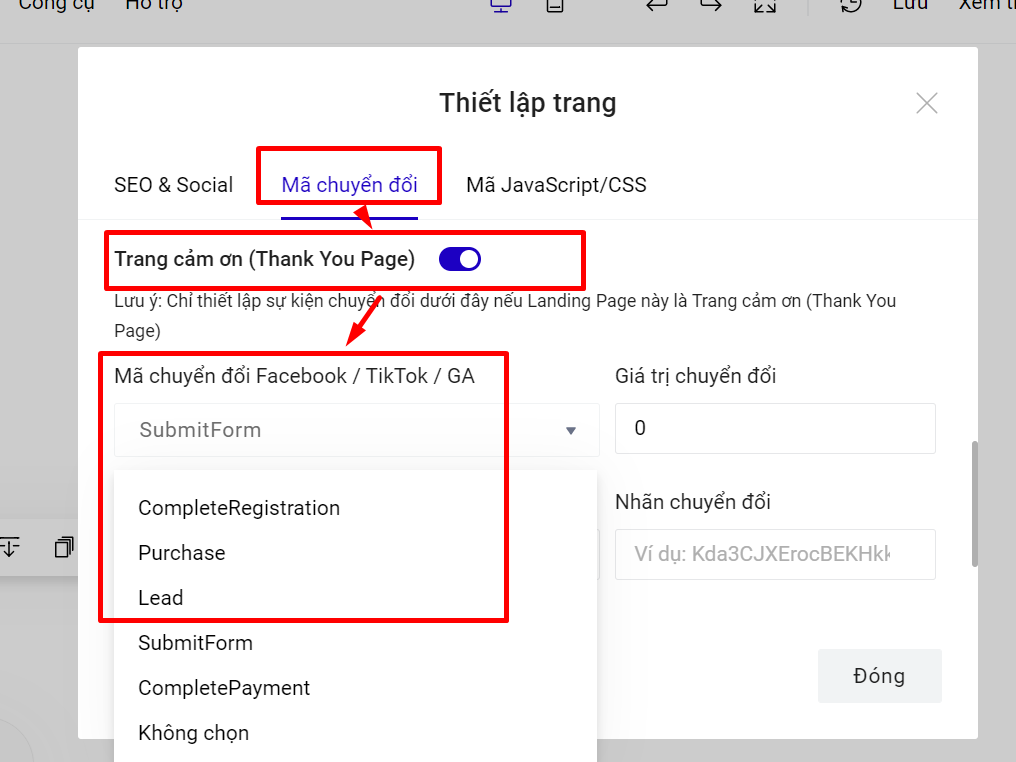 Cách 1: Sử dụng phần mã sự kiện chuyển đổi + giá trị chuyển đổi của form LadiPage.