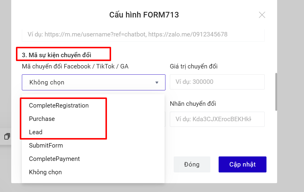 Mã chuyển đổi Facebook/Google Analytics: chọn mã sự kiện bạn muốn sử dụng.