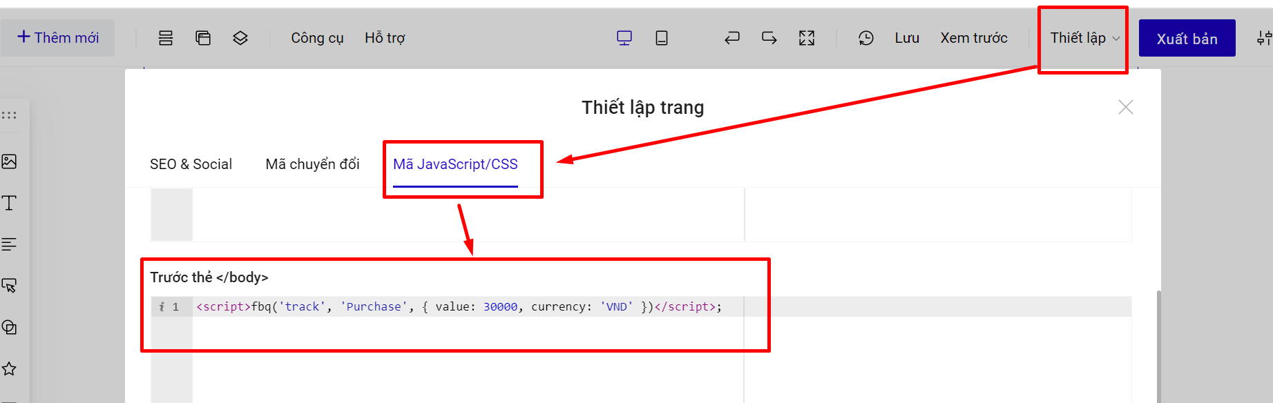 Cách 2: Sử dụng phần mã sự kiện chuyển đổi + giá trị chuyển đổi của Facebook.