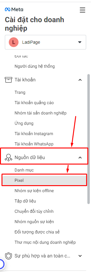 Bước 3: Thiết lập pixel . Bạn chọn mục Nguồn dữ liệu-> Pixel