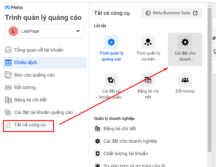 Bước 2: Nhấp vào thanh Trình quản lý quảng cáo, chọn Tất cả công cụ -> Cài đặt cho doanh nghiệp