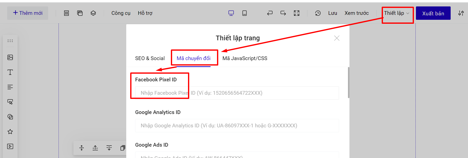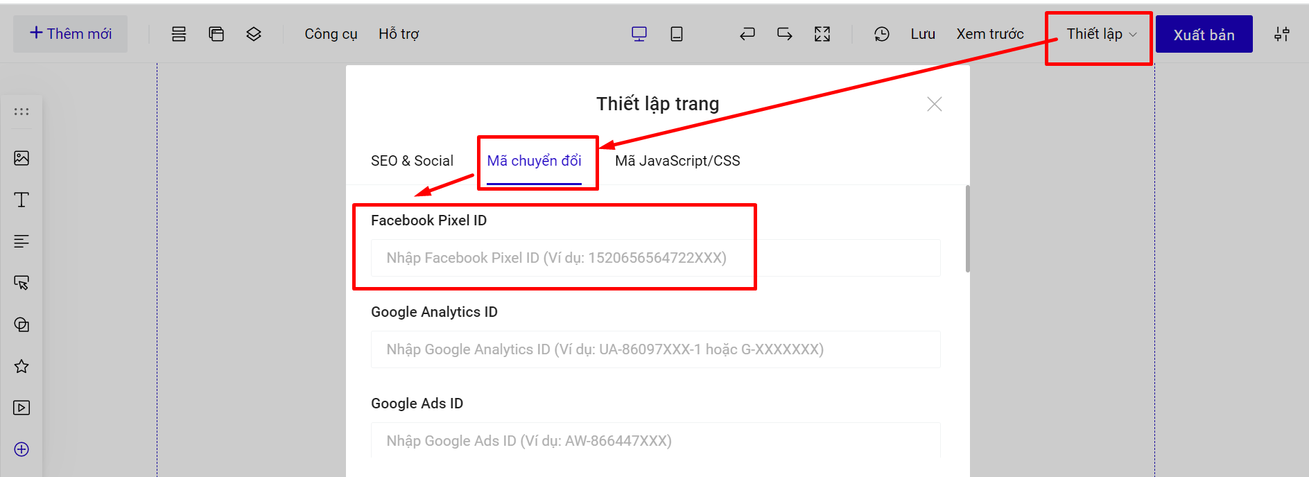 Bước 9: Quay trở lại builder trang thiết kế Landing Page, vào phần Thiết lập mã chuyển đổi và dán mã pixel ID vừa sao chép vào ô Facebook Pixel ID: