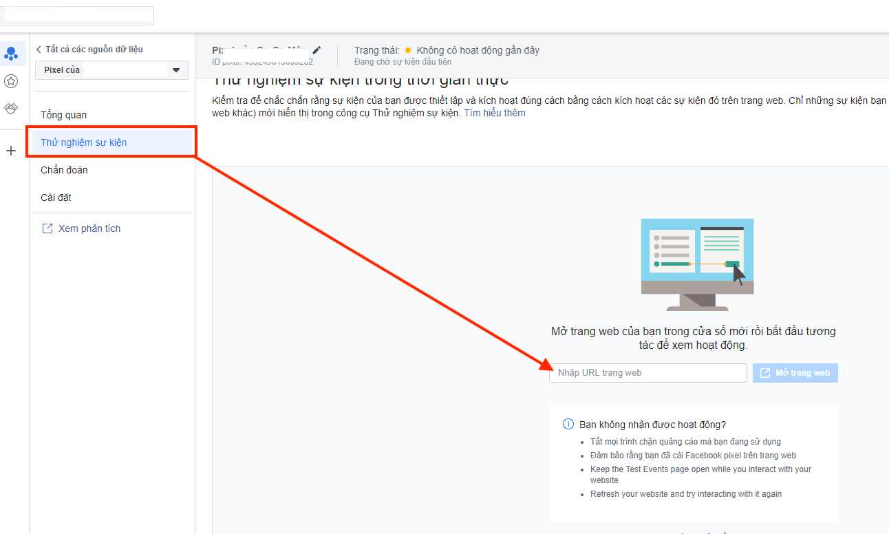 Truy cập vào trình quản lý pixel và vào mục Test events (kiểm nghiệm sự kiện).
