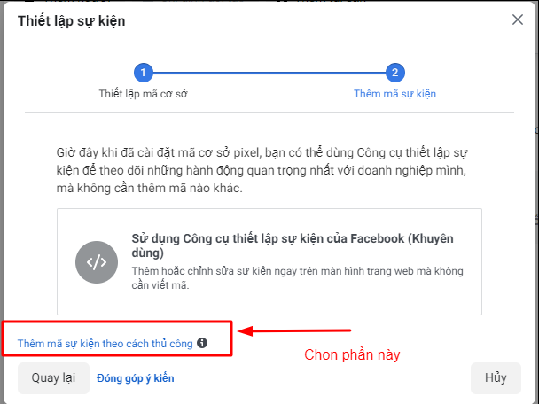 Bước 6: Trong hộp thoại Thiết lập sự kiện, chọn Thêm mã sự kiện theo cách thủ công.