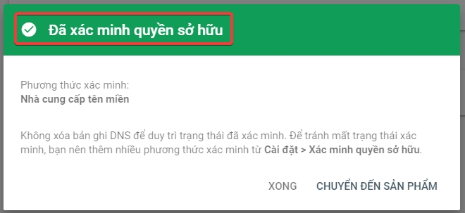 Như vậy, bạn đã hoàn tất quá trình xác mình tên miền của bạn với dịch vụ Google.