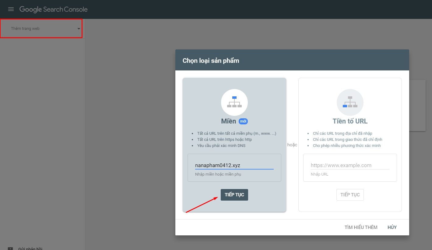 Bước 1: Tuy cập vào Google Search Console → Tìm kiếm sản phẩm → Thêm trang web.