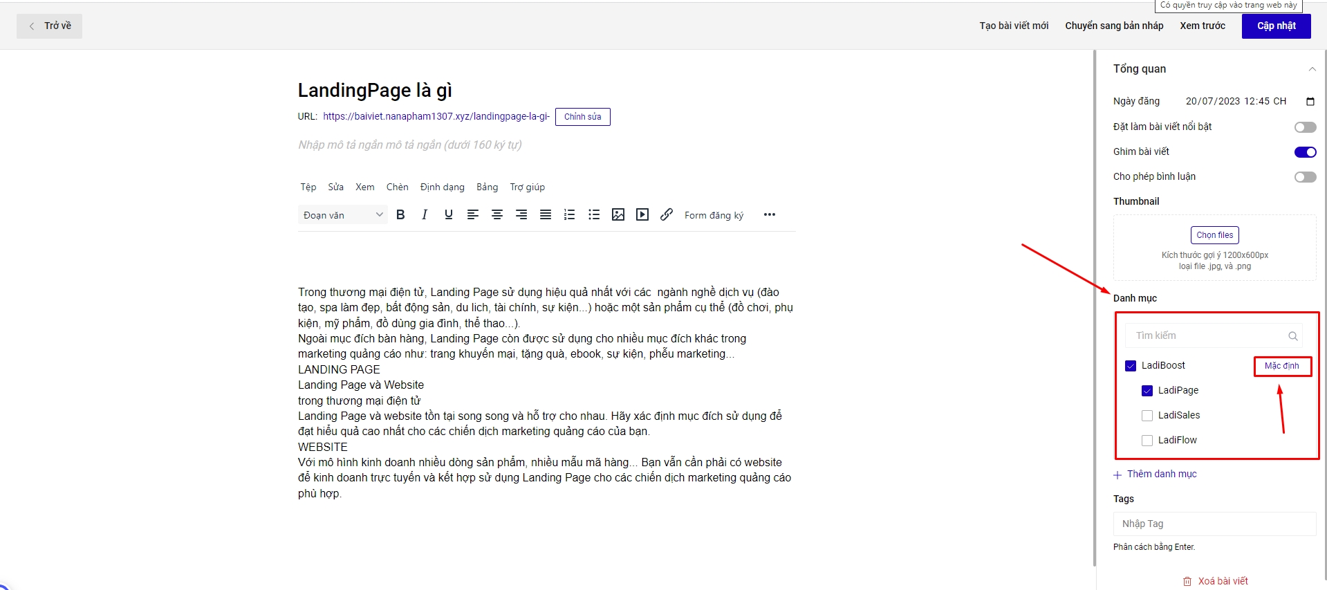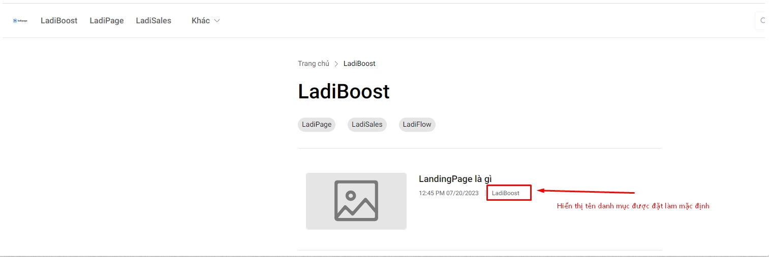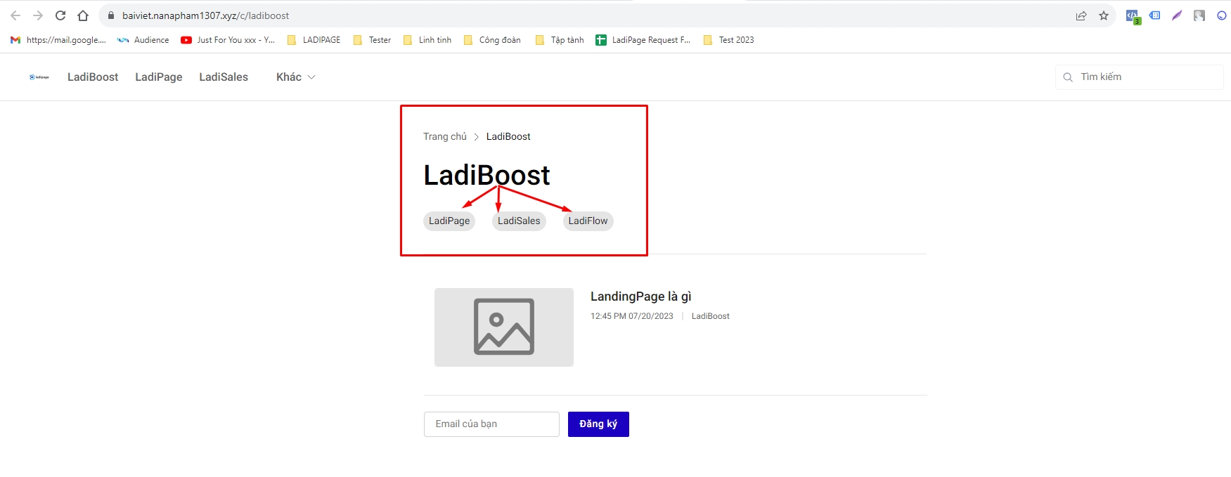 Danh mục cha con sẽ giúp bạn tối ưu thêm phần hiển thị khi truy cập danh mục trên trang xuất bản. Khi truy cập vào danh mục Cha ( ví dụ LadiBoost ) sẽ hiển thị các danh mục Con ( LadiPage, LadiSales, LadiFlow ) để mình có thể lựa chọn và truy cập