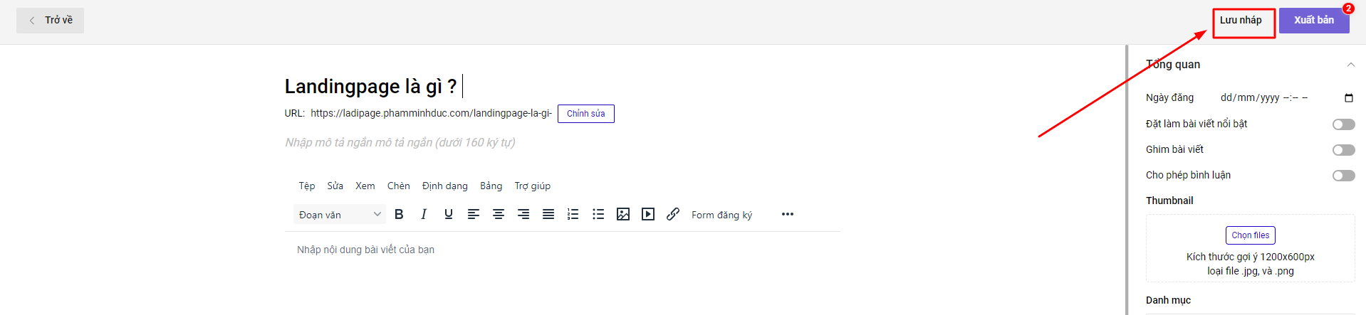 Lưu nháp :trong trường hợp bạn muốn tạo nội dung bài viết nhưng chưa muốn xuất bản, bạn có thể sử dụng tính năng Lưu nháp