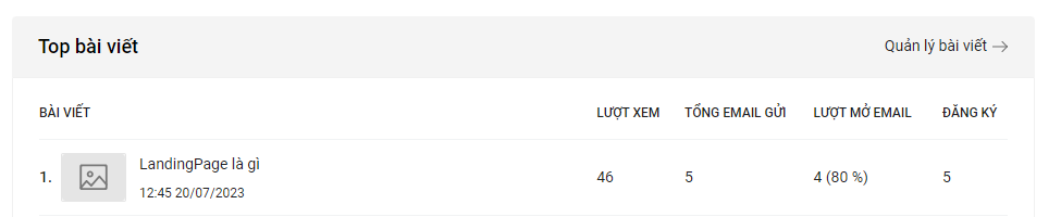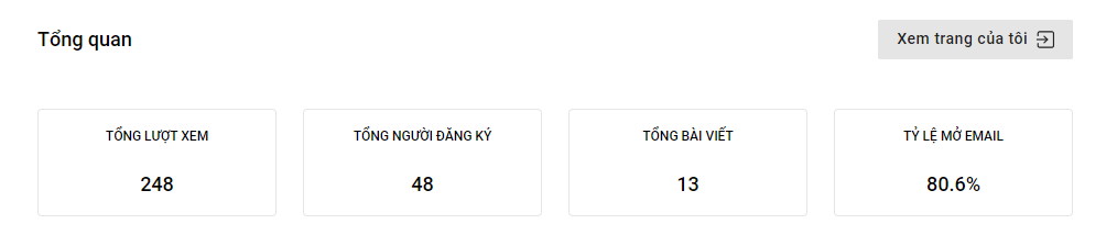 Truy cập mục Blog & Newsletter-> Tổng quan để xem phần thống kê các chỉ số cho trang blog
