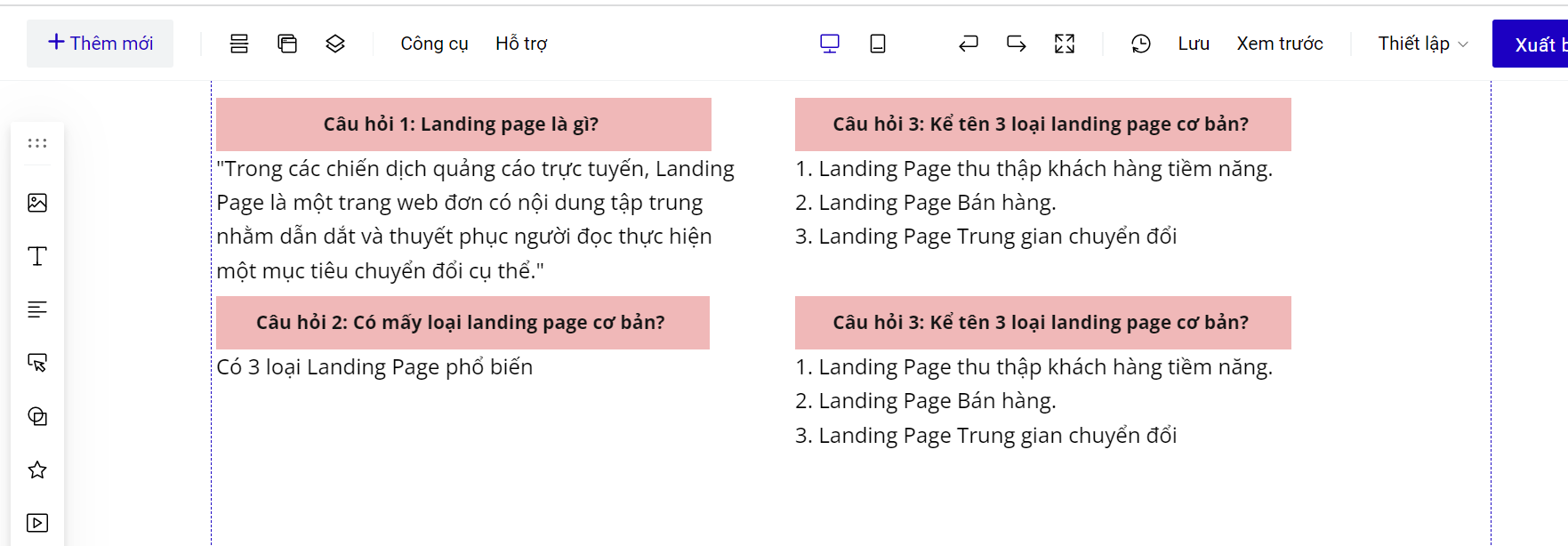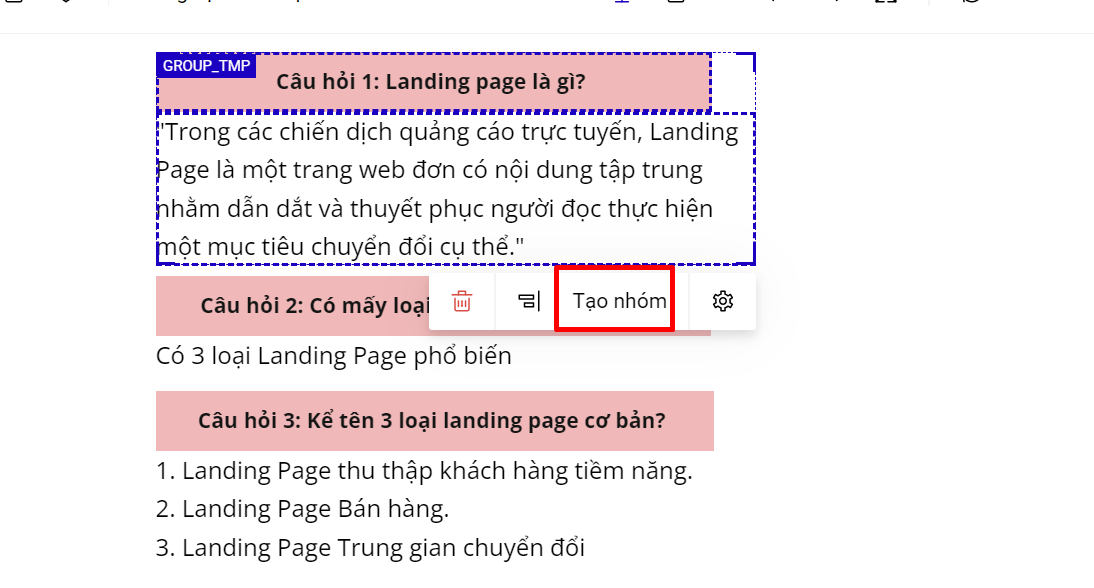 Bước 3: Nếu bạn có nhiều câu hỏi và câu trả lời, bạn muốn khi xuất bản sẽ hiển thị khoảng cách các câu hỏi và câu trả lời được đều, bạn tạo nhóm câu hỏi và câu trả lời lại với nhau.