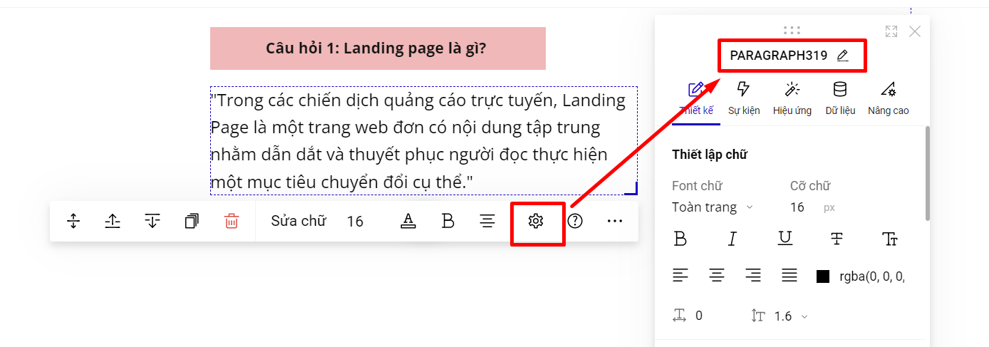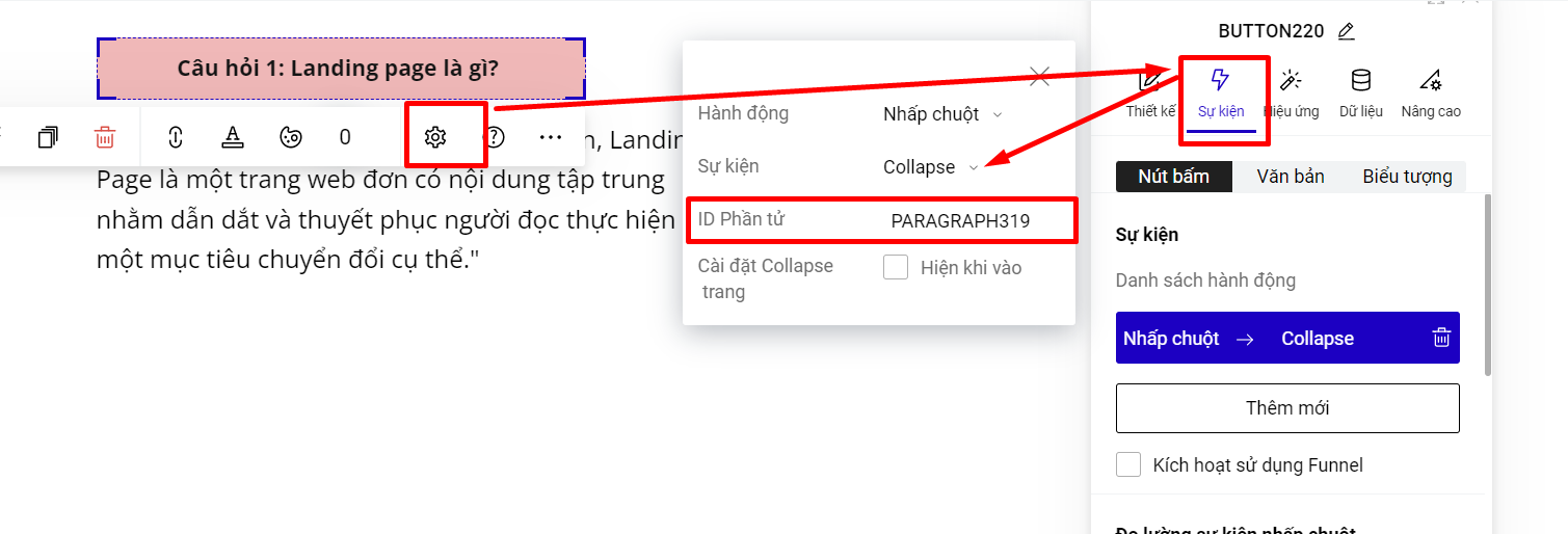 Bạn sẽ dán ID phần tử muốn Collapse đến (Ở đây là dán ID phần tử câu trả lời). Bạn có thể cài đặt hiển thị nội dung chi tiết (câu trả lời) ngay khi khách truy cập vào trang landing page.